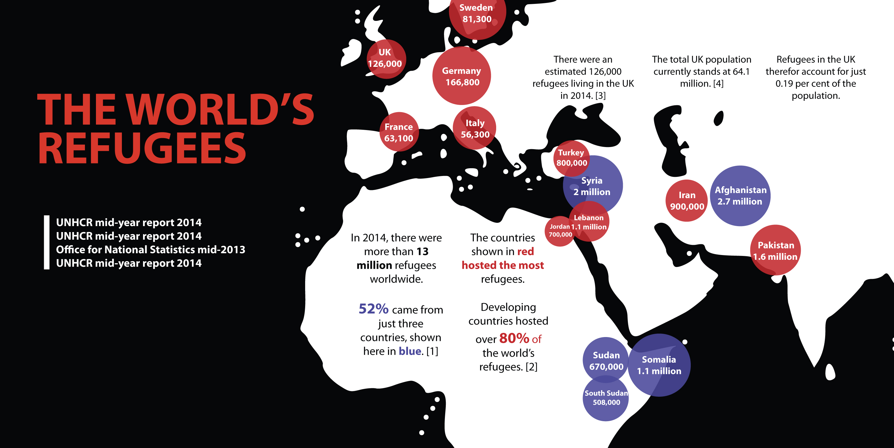 - The number of people forced to flee their homes last year, across the world, exceeded 50 million – for the first time since the Second World War. However, most people don’t come to Europe, as the map below shows. They either stay inside their country (‘internally displaced’) or flee over their nearest border. Source: UNHCR mid-year report 2014
