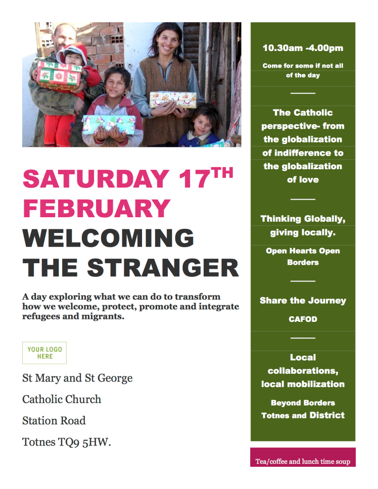 Welcoming the Stranger – a day of talks and discussions about asylum and refugee realities organised by the Totnes Catholic Church – with input from Father Kristian, from the Bishop of Plymouth Diocese, CAFOD, Open Hearts Open Borders, Beyond Borders Totnes & District.